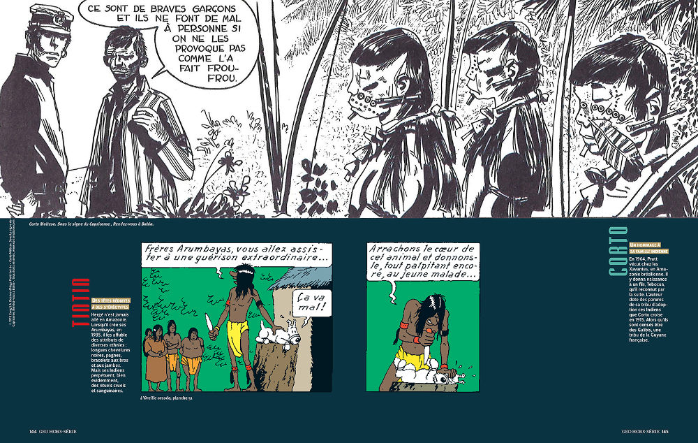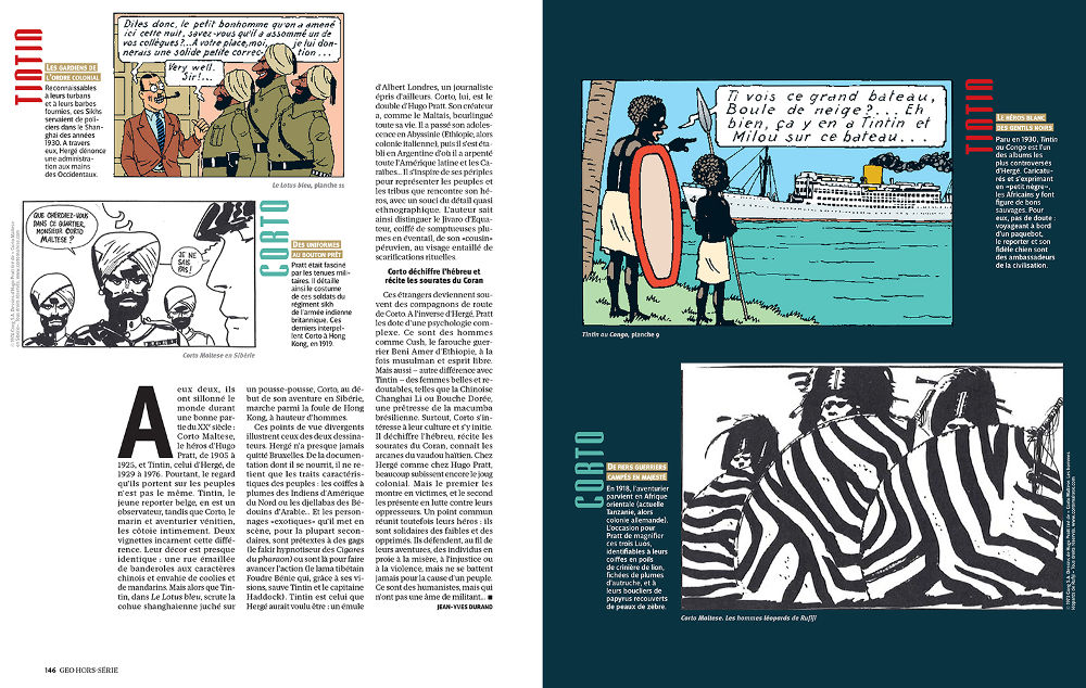 Dans ce Hors Série GÉO dédié à Tintin de Hergé, figure un article présentant un regard croisé entre deux fameux personnages du 9ème Art: Tintin & Corto Maltese