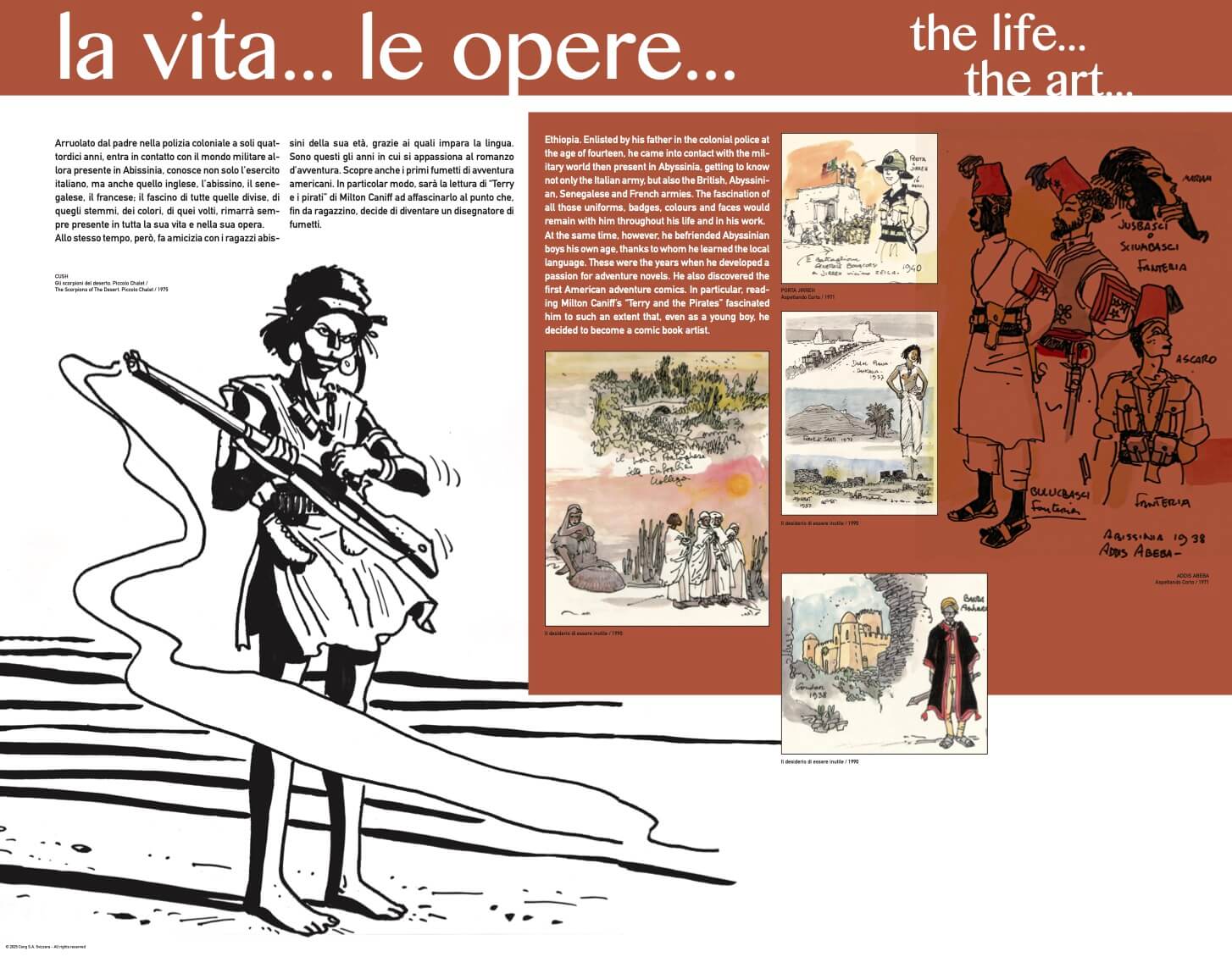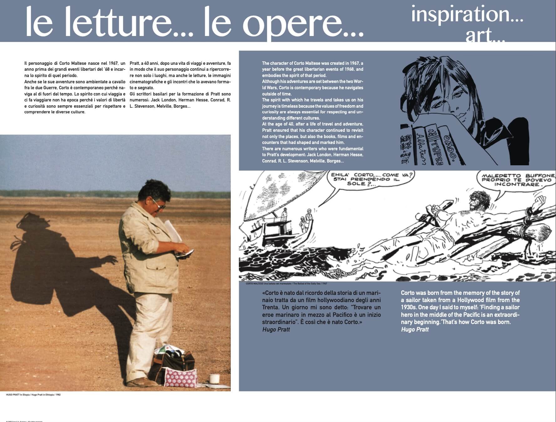The largest part is dedicated to Hugo Pratt, his travels, books and readings that shaped his narrative universe and the idea of graphic literature.