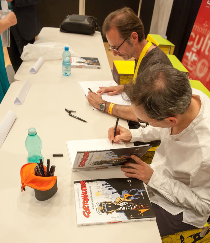 Un pomeriggio dedicato a Hugo Pratt e Corto Maltese, attraverso le dediche di Canales e Pellejero, le immagini della mostra e il dibattito con gli autori di Sotto il sole di mezzanotte.