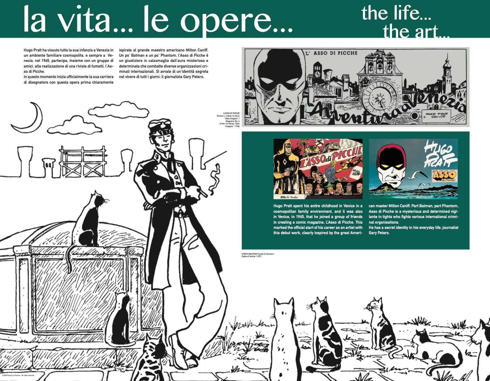 En los sótanos de la Rocca, en un ambiente de magia antigua entre ladrillos y techos abovedados, se puede recorrer en dos salas de exposición la formidable vida de Pratt, desde su infancia en Venecia hasta su adolescencia en Etiopía durante la guerra, desde sus primeras láminas en tinta china hasta su consagración en Argentina, desde su regreso a Italia en los años sesenta hasta el éxito mundial con la creación de Corto Maltés.