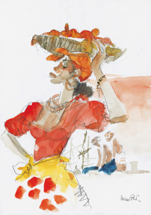 Ses magnifiques aquarelles sur cet inépuisable sujet sont strictement liées à ses voyages. Au cours de toute son existence d’artiste, Pratt a rendu hommage à des femmes rêvées et à des femmes réellement rencontrées, aux jeunes filles croisées sur des îles lointaines, ou aux personnages mythiques suggérés par la littérature et par le cinéma, telles que Pandora, Louise Brooks, Hipazia, Bouche Dorée et Shanghai Lil.