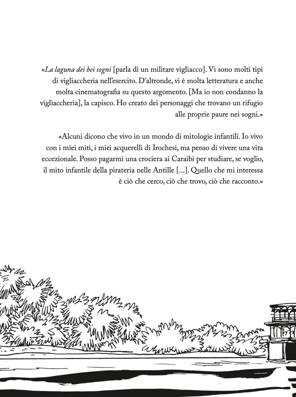Da tre giorni, sul delta del fiume Orinoco, un tamburo risuona e diffonde la notizia di un bianco malato nella Laguna dei bei sogni. Con la fronte imperlata di sudore, la barba incolta, due solchi neri e profondi che incorniciano gli occhi dallo sguardo febbrile, il tenente Stuart degli Artists Rifles è deciso a restare su quelle rive malsane e popolate da insetti letali. Lì, “dove quando si comincia a sognare non ci si sveglia più”, avvolti da un mortale torpore che annebbia la vista e confonde i ricordi. Eppure, ci sarebbero molti altri modi per uscire da una vecchia vita…